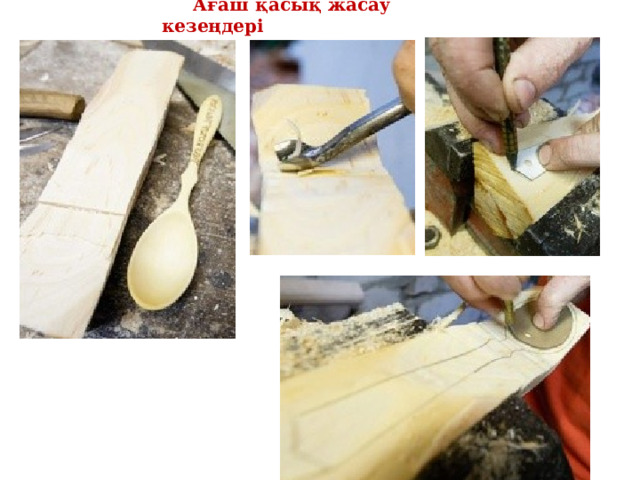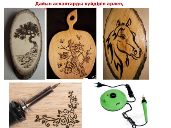 Қазақ халқының ағаш бұйымдары (оюлы сандық, астау, тостаған т.б.) Құрал-саймандарды таныстыру: Қол ара, сүргі, қашау, балға, бұрғы т.б. Әр құралдың қолданылу тәсілі көрсетіледі Қауіпсіздік ережелері: Құралды дұрыс ұстау Жұмыс орнын таза ұстау Өткір құралды абайлап қолдану |
