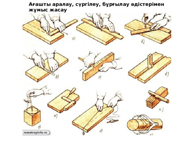 Ара – ағашты кесуге арналған. Балға – шегелерді қағуға арналған. Қашау – ойық ойып, ағашты өңдеуге арналған. Сүргі – ағаш бетін тегістеуге арналған. Егеу – қырларын тегістеуге арналған. Интерактивті слайд, бейнематериал көрсету. |