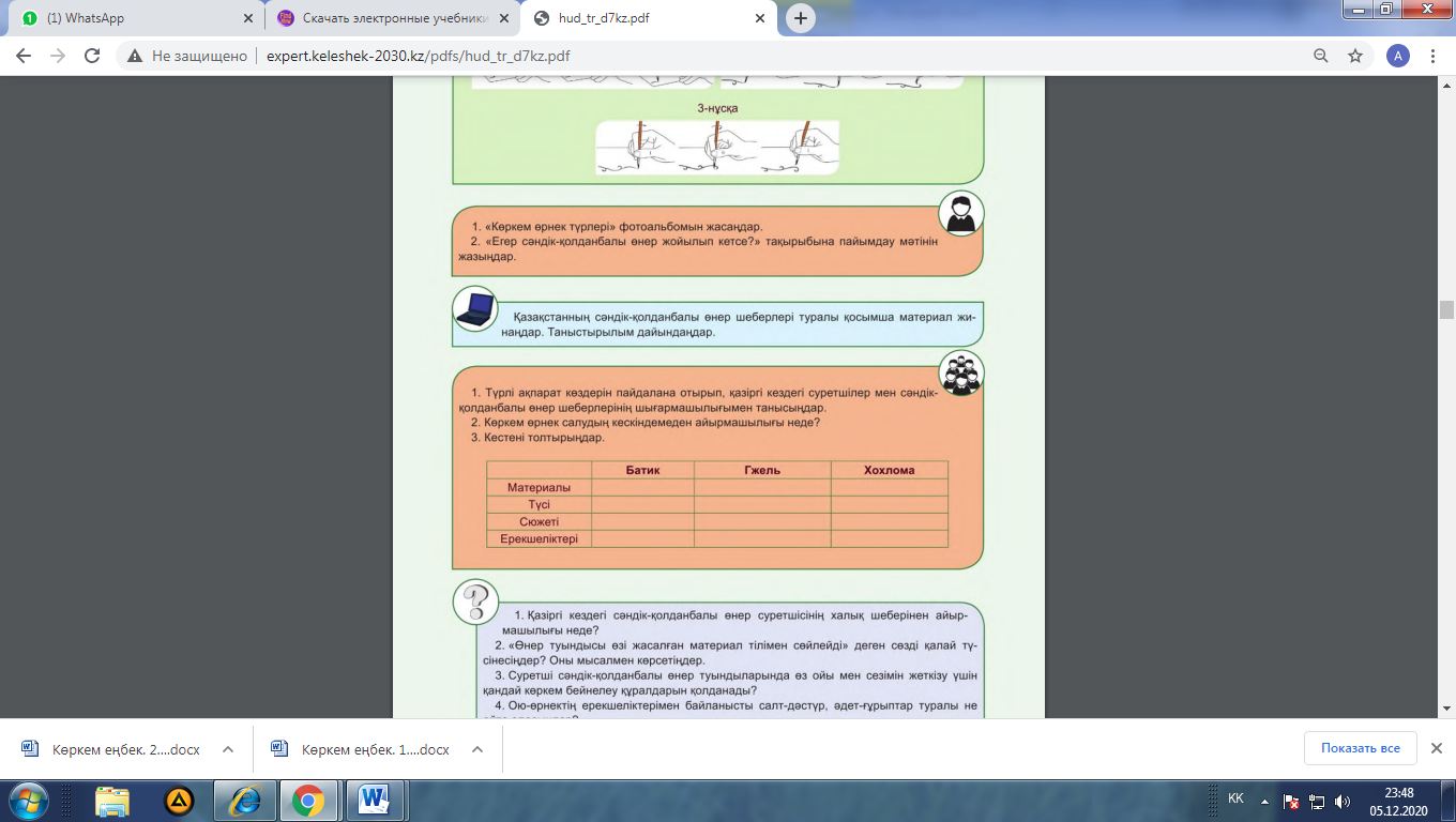 4-тапсырма: 1.Түрлі ақпарат көздерін пайдаланып, қазіргі кездегі суретшілер мен сәндік-қолданбалы өнер шеберлеріонің шығармашыолығымен танысады. 2.Көркем өрнек салудың кескіндемеден айырмашылығы неде? 3.Кестені толтырады.
