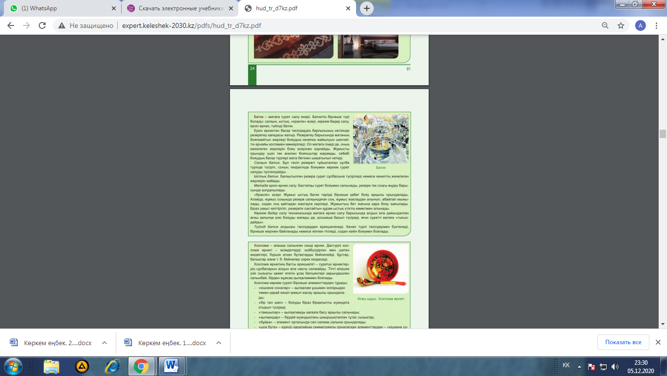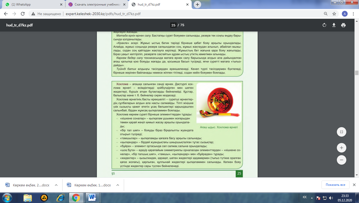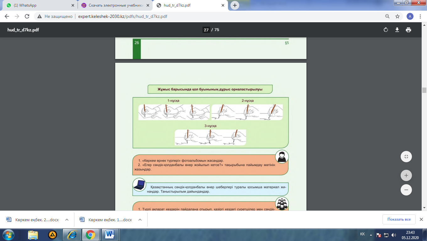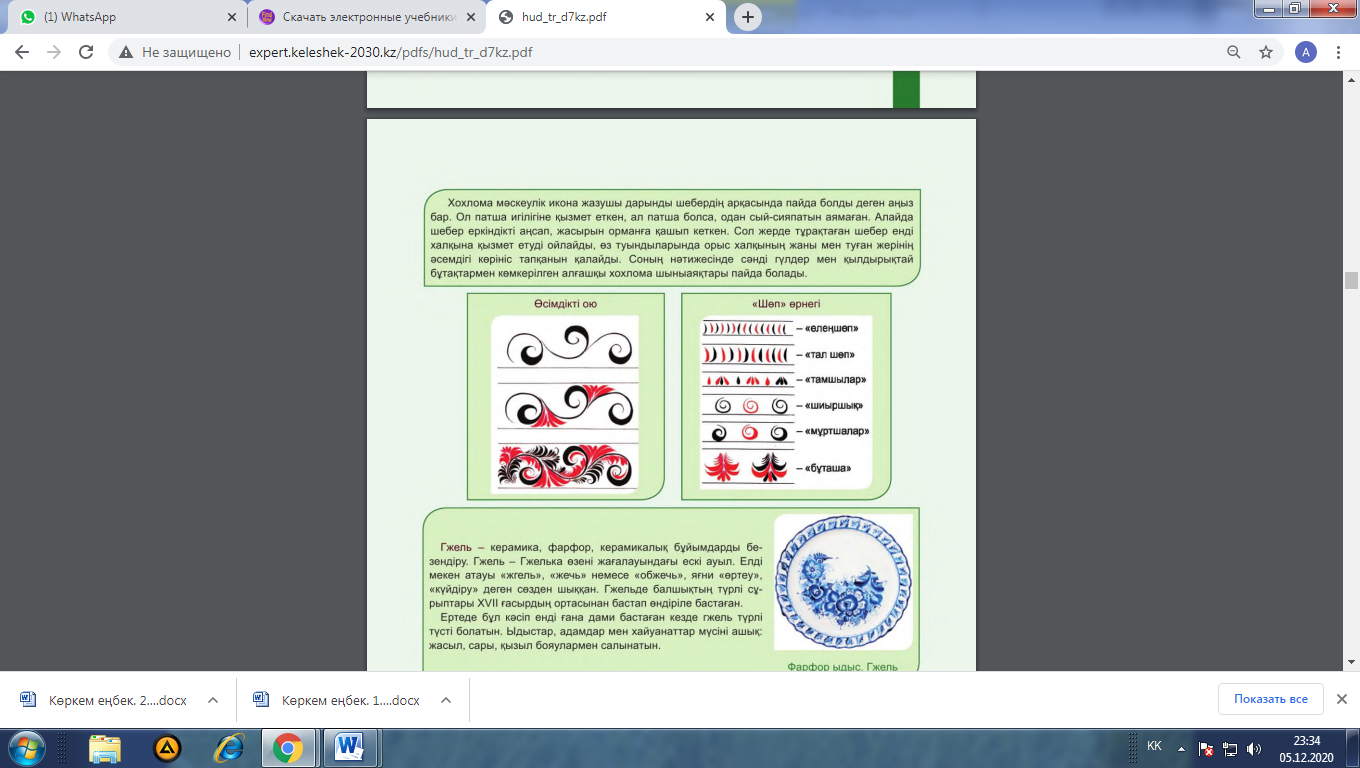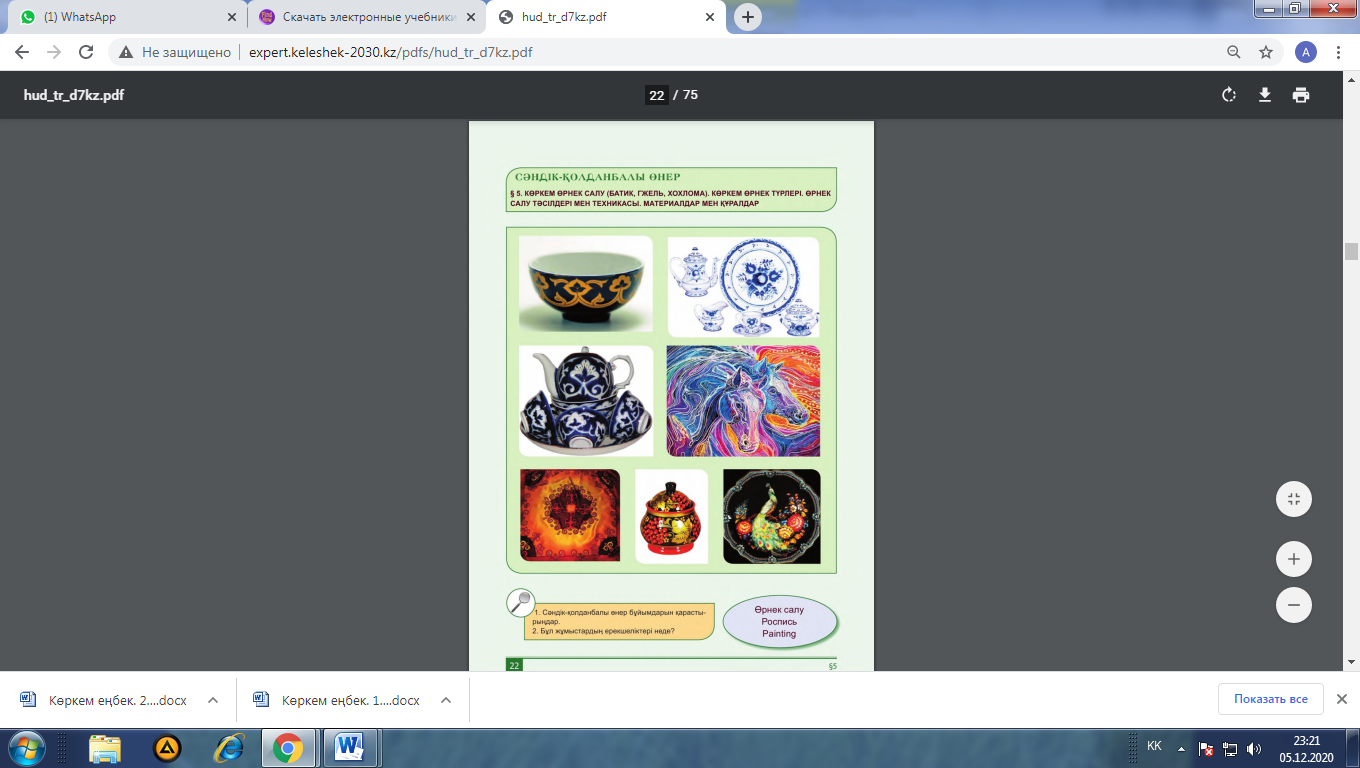 1-тапсырма: 1. Сәндік-қолданбалы өнер бұйымдарын қарастырады 2.Бұл жұмыстардың ерекшелігі неде сипаттайды.