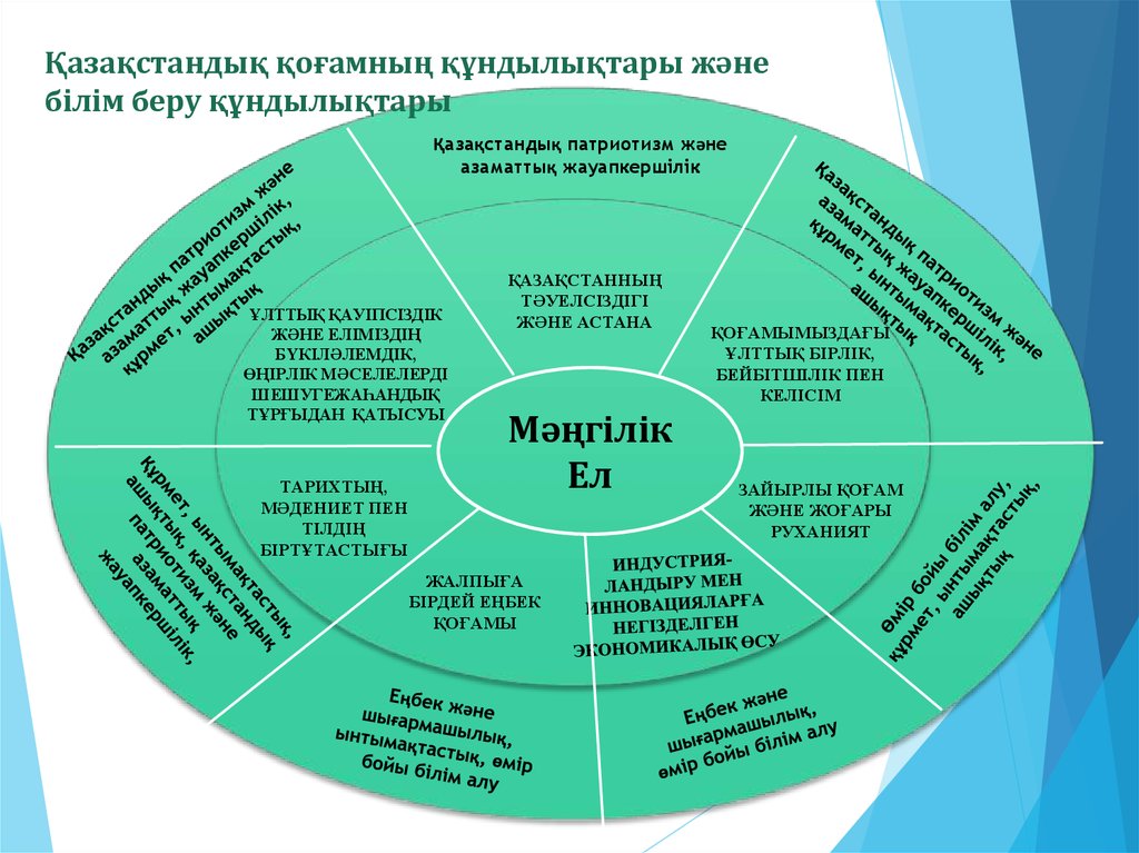 Қазақстандық патриотизм және азаматтық жауапкершілік (Отанға және халқына деген сүйіспеншілік, елінің жетістіктері үшін мақтаныш, Қазақстан мүддесіне қызмет ету) бірінші құндылықты біз өз көркем еңбек сабағымызбен байланыстыратын болсақ, қазақтың ұлттық тағамдары, ұлттық ойындары, салт – дәстүрлері мен ою – өрнектерінің өзінде тұнып тұрған тәрбие бар. Сондықтан оқу-тәрбие жұмысының барысында, технология сабағында оқушыларға кәсіби технология пәнінің үйірме жұмыстарында халқымыздың ұлттық қолөнерін халқымыздың салт-дәстүрімен, әдет-ғұрпымен таныстыра отырып, оқушының іскерлігін, дағдысын, еңбекке деген ынтасын қалыптастыруды негізгі мақсат етіп қою- біздің міндетіміз. Осы тұрғыда мен мектеп оқушыларымен бірге “Қазақтың сәулет өнері” атты көрме ұйымдастырдық. Көрменің мақсаты оқушыларға қазақтың салт дәстүрлері, батырлары, аспаптары, ою – өрнектерін қайта жаңғырту арқылы оқушылар бойында патриоттық сезімді ояту.
