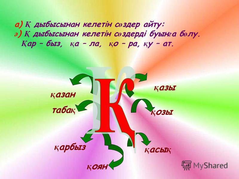 Жаңылтпашты кім тез жаттай алады? Пеш үстінде бес мысық, Бес күзетші – бес пысық Жайлау Жайлау – жазғы қоныс. Жайлауды суы мол, шөбі шүйгін, маса-сона, шыбын-шіркейі аз жерлерден таңдайды. Онда жылдың үш маусымында да ел болмайды. Күзде иен жұртқа қаулап майда көк өседі. Қыста аппақ қар басып жатады. Ал жазға қарай жайлаудың шөбі жетіле бастайды. Ол кезде жер беті масаты кілемнің түріндей құлпырады. Қыста әбден арықтап, көтерем болып шыққан мал жайлауға іліккеннен соң-ақ тойынып секіреді. Мал ғана емес, адамдар да серігіп, жиын-той өткізіп, аунап-қунап қалады. Бие байлап, қымыз ішеді, айран ұйытып, құрт жинайды, ірімшік қайнатады. Қысқа арнап азық-түлік жинайды. Тапсырма: Буынға бөлінбейтін сөздерді теріп жаз 3-тапсырма. Ребусты шешіп, сөйлем құрап жаз 7+ су, 5 + ік, 100 + ім Үйге тапсырма: Тақпақты жаттау Пернеш келді дүкенге, Пияз, сәбіз алмақшы. Пісіруге дәмді ас, Палауға оны салмақшы. |