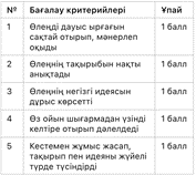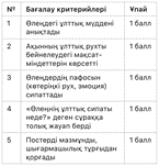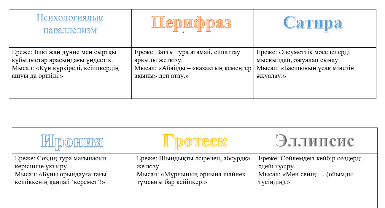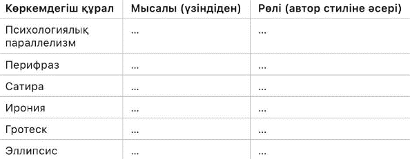 8.2.3.1 шығармадағы көркемдегіш құралдардың (психологиялық параллелизм, перифраз, сатира, ирония, гротеск, эллипсис) қолданысын талдай отырып, автор стилін анықтау 8.3.4.1 шығарма бойынша жазылған әдеби сын-пікірлерге сүйене отырып, өзіндік сыни пікір жазу |