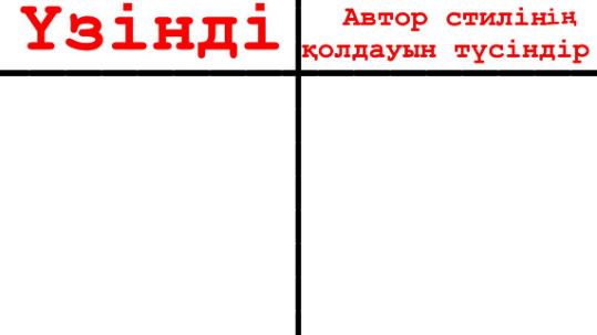 1-тапсырма Жеке жұмыс. 1.Кестені толтырады 2.Үзіндіні таңдайды 3.Автор стилінің қолдануын түсіндіреді