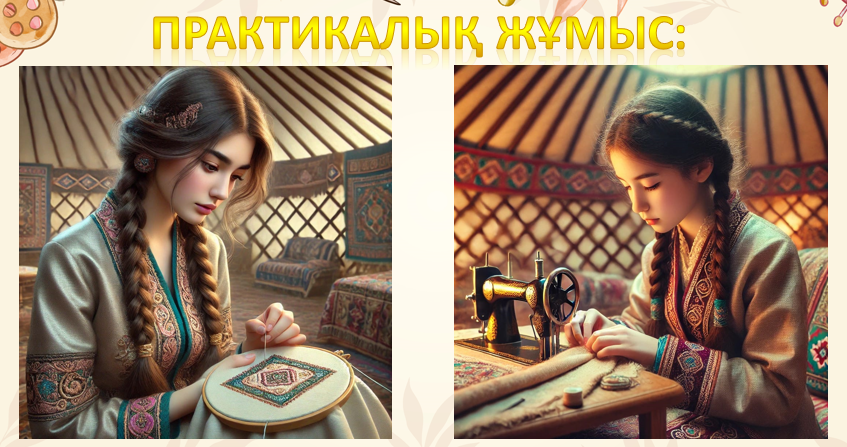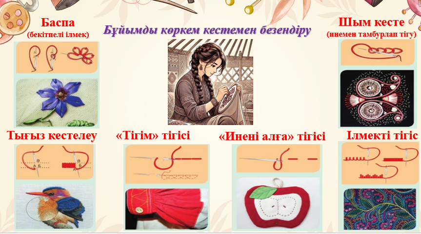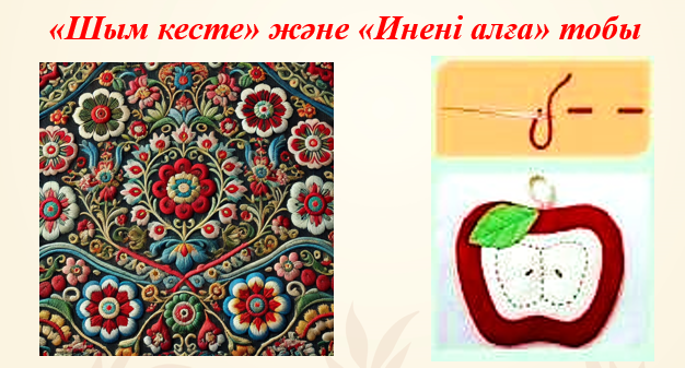 2. Қауіпсіздік ережелері: 1. Ине мен қайшыны дұрыс пайдалану Ине мен қайшыны тек жұмыс істеу үшін пайдаланыңыз, оларды басқа мақсатқа қолданбаңыз.Қолданылып болған инені арнайы инеқапқа салып қойыңыз, үстел үстінде немесе жерде қалдырмаңыз.Қайшыны ұсынғанда, сабын қаратып беріңіз және кесу кезінде абай болыңыз. 2. Жұмыс орнын ұйымдастыру. Жұмыс орнын жарықтандырып, ыңғайлы отырыңыз.Матаны кестелеу барысында қолғап қолдануға болады, егер ине қолды жаралап кетуі мүмкін болса.Арнайы жастықша немесе кестеге арналған раманы пайдалану ыңғайлы және қауіпсіз жұмыс істеуге көмектеседі. 3. Көзді қорғау. Кесте тігу кезінде көзді шаршатпау үшін әр 20-30 минут сайын үзіліс жасаңыз.Жақсы жарық қажет болғандықтан, кешкі уақытта немесе күңгірт бөлмеде қосымша шам қолданыңыз. 4. Жіппен жұмыс істеу. Жіпті тым ұзын қылып алудан сақтаныңыз, себебі ол оңай шатасып, қолыңызға оралып қалуы мүмкін.Жіпті ауызға салмаңыз, тек қолмен немесе арнайы кескішпен кесіңіз. 5. Жұмыс орнын таза ұстау. Жұмыс соңында барлық құралдарды жинап, қауіпсіз жерге орналастырыңыз.Инелер мен түйреуіштерді арнайы қорапшада сақтаңыз, балалардың қолы жетпейтін жерде болғаны абзал. Осы ережелерді сақтау арқылы кесте тігуді қауіпсіз әрі ыңғайлы жасауға болады. Практикалық жұмыс (20-25 мин) 1. Дайындық: Оқушыларға кесте салуға арналған маталар, жіптер мен инелерді тарату. 2. Тапсырма: Әр оқушыға қарапайым өрнекті таңдап, оны Шым кесте және «Инені алға» әдісі арқылы кестелеу. 3. Қадағалау және көмек көрсету: Мұғалім оқушыларға әр кезеңде бағыт-бағдар беріп, қателерін түзетуге көмектеседі. Сергіту сәті Кел, балалар, тұрайық, Алақанды созайық. Бір отырып, бір тұрып, Біз тынығып алайық. Бас аяқпен топ-топ, Шапалақпен хоп-хоп. Бір оңға, бір солға, Өзімді-өзім айнала. Сабақты бекіту сұрақтары: