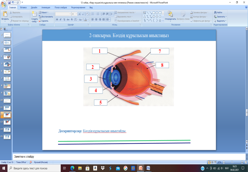 Көздің құрам бөліктері мен қызметтерін сәйкестендіреді. Бір-біріне жақын орналасқан оқушылар дәптерлерін алмасып бір-бірін «Диірмен» әдісі арқылы тексереді.
