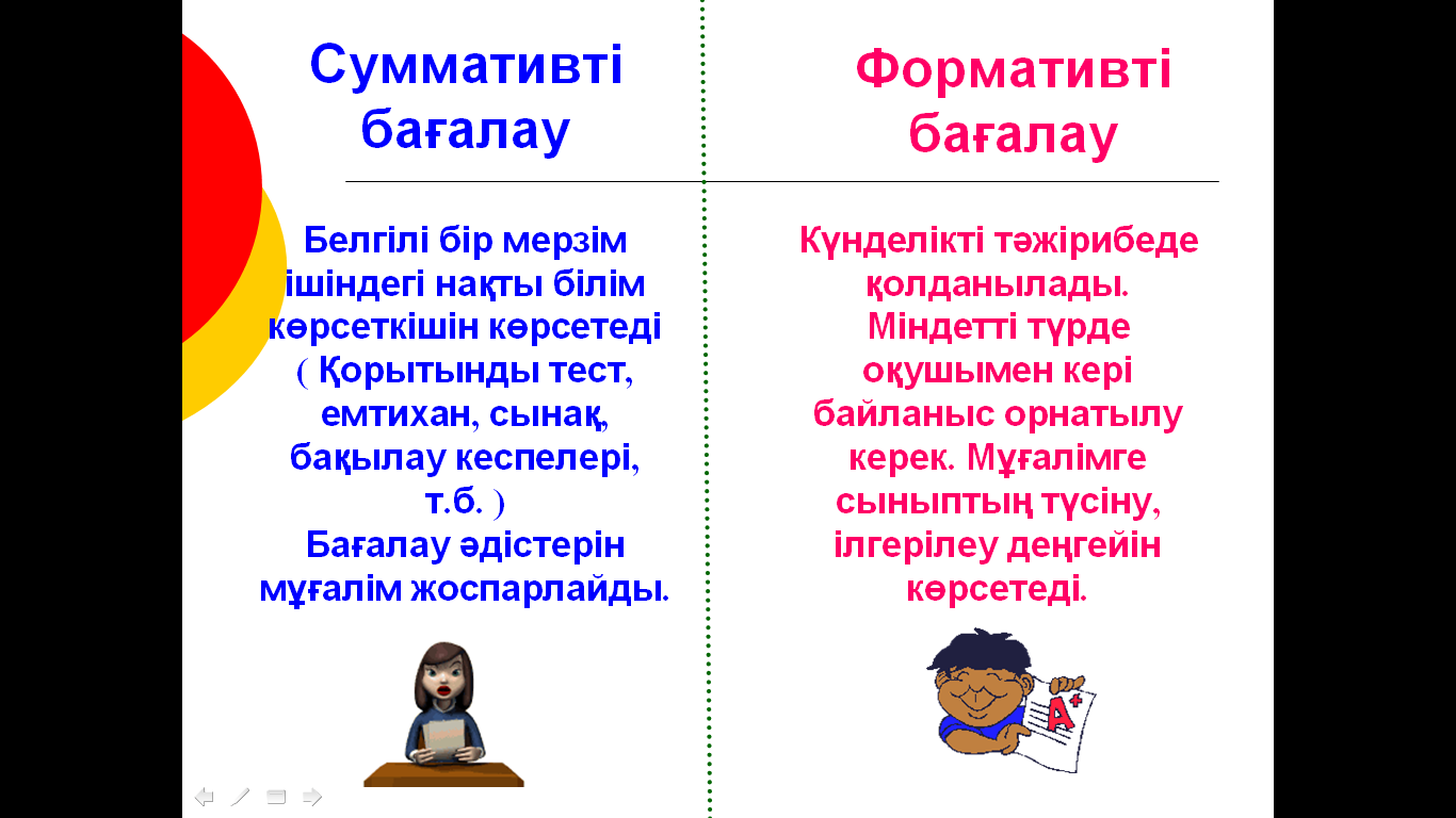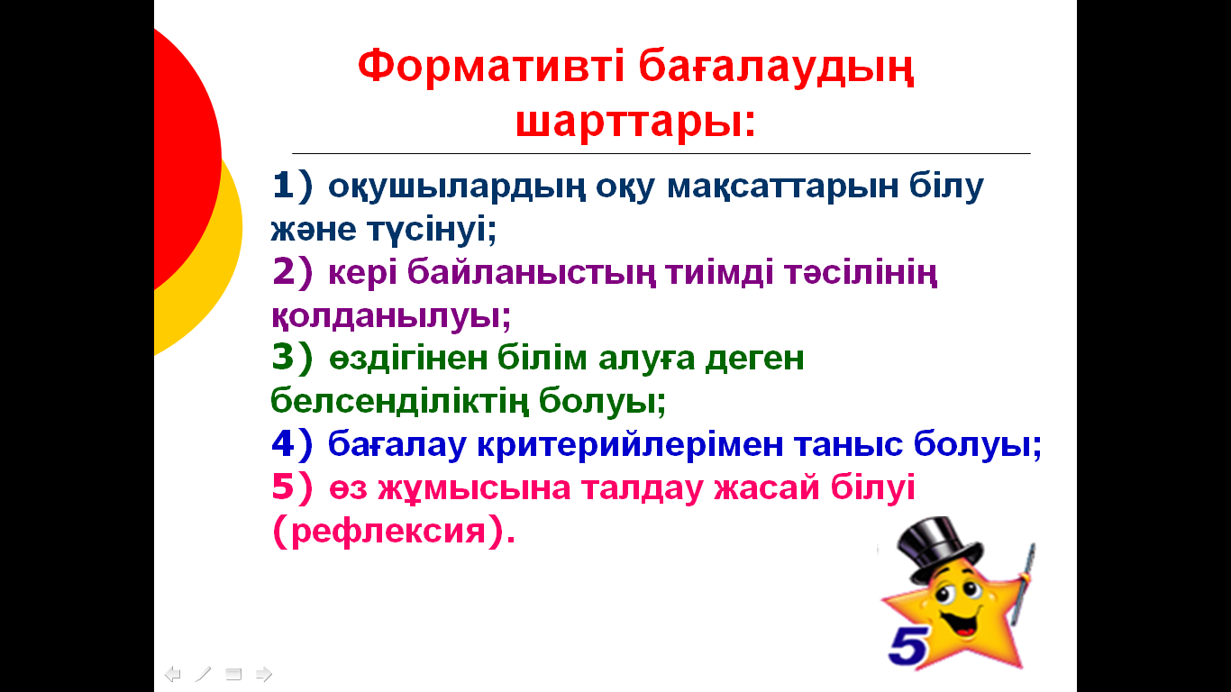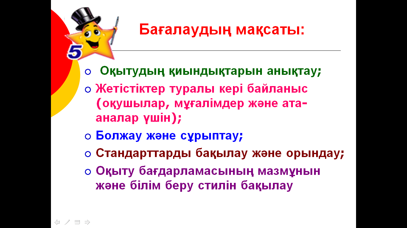 Әріптестерімізді педагогикалық тәжірибесін жетілдіру мақсатында инновациялық идеялармен таныстыру, шығармашылық қабілетін ұштау, жаңа формациядағы бағалау түрлерін тәжірибеге енгізуге ықпалдасу. Мұғалімдерге оқушылардың айқындалған критерийлерге сәйкес өз жұмысының сапасы туралы қорытынды жасай бiлуге қол жеткізуін үйрету, өзiн-өзі бағалау және өзара бағалау үдерiстерiнің дамуына ықпал ету