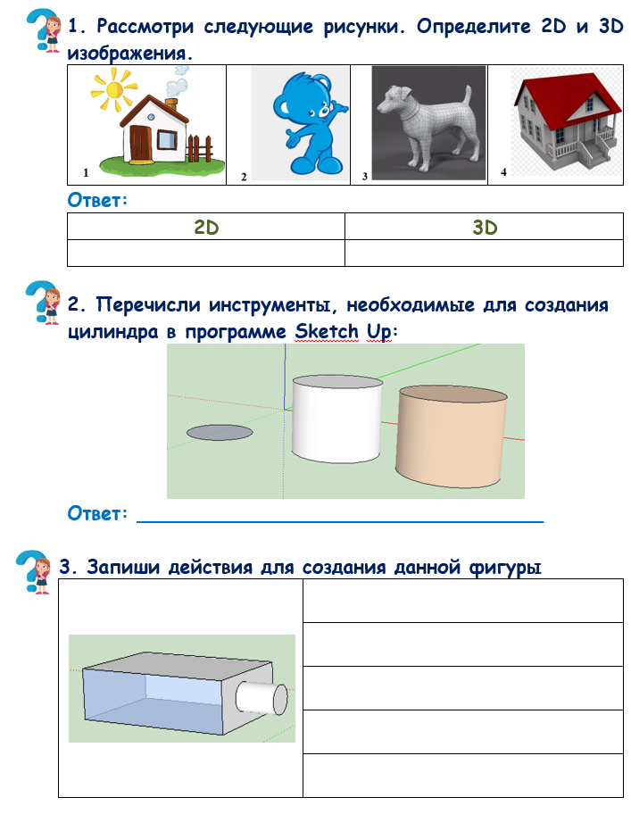 Знакомится с основной информацией, маркируют текст специальными значками Описывают функции Выполняют упражнения для глаз Определяет 2D и 3D рисунки Перечисляет инструменты, необходимые для создания цилиндра Записывает действия для создания фигуры Выполняет задание по ФГ, отвечает на вопрос Работает с ИИ Выполняет интерактивное задание Создает модель |