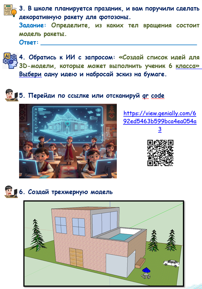 Дескрипторы: – описывают функции Критерий оценивания: демонстрирует знания о 3D-моделировании Дескрипторы: правильно определяет 2D и 3D изображения;(2 балла) называет инструменты SketchUp, необходимые для создания цилиндра;(1 балл) описывает последовательность действий для построения 3D-фигуры;(2 балла) определяет тела вращения в модели ракеты;(1 балл) использует ИИ для поиска идеи 3D-модели и создаёт эскиз;(1 балл) выполняет создание простой 3D-модели в программе.(3 балла) |