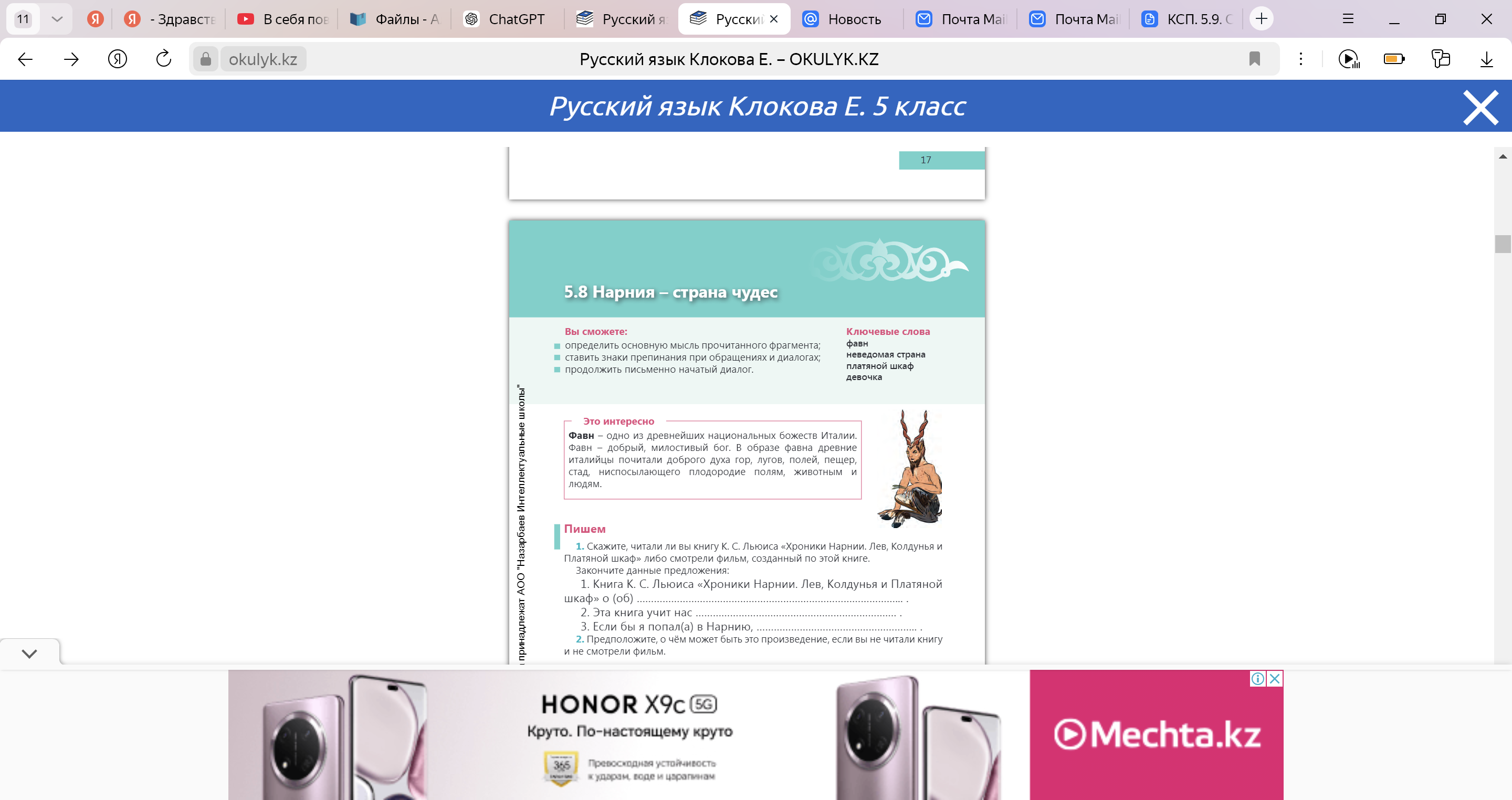 Задание 1. Скажите, читали ли вы книгу К.С.Льюиса «Хроники Нарнии. Лев, Колдунья и Платяной шкаф» либо смотрели фильм, созданный по этой книге? Закончите данные предложения: 1. Книга К.С.Льюиса «Хроника Нарнии. Лев, Колдунья и Платяной шкаф» о (об) …………. . 2. Эта книга учит нас ……… . 3. Если бы я попал(а) в Нарнию, ……… . Предположите, о чем может быть это произведение, если вы не читали книгу и не смотрели фильм. |
