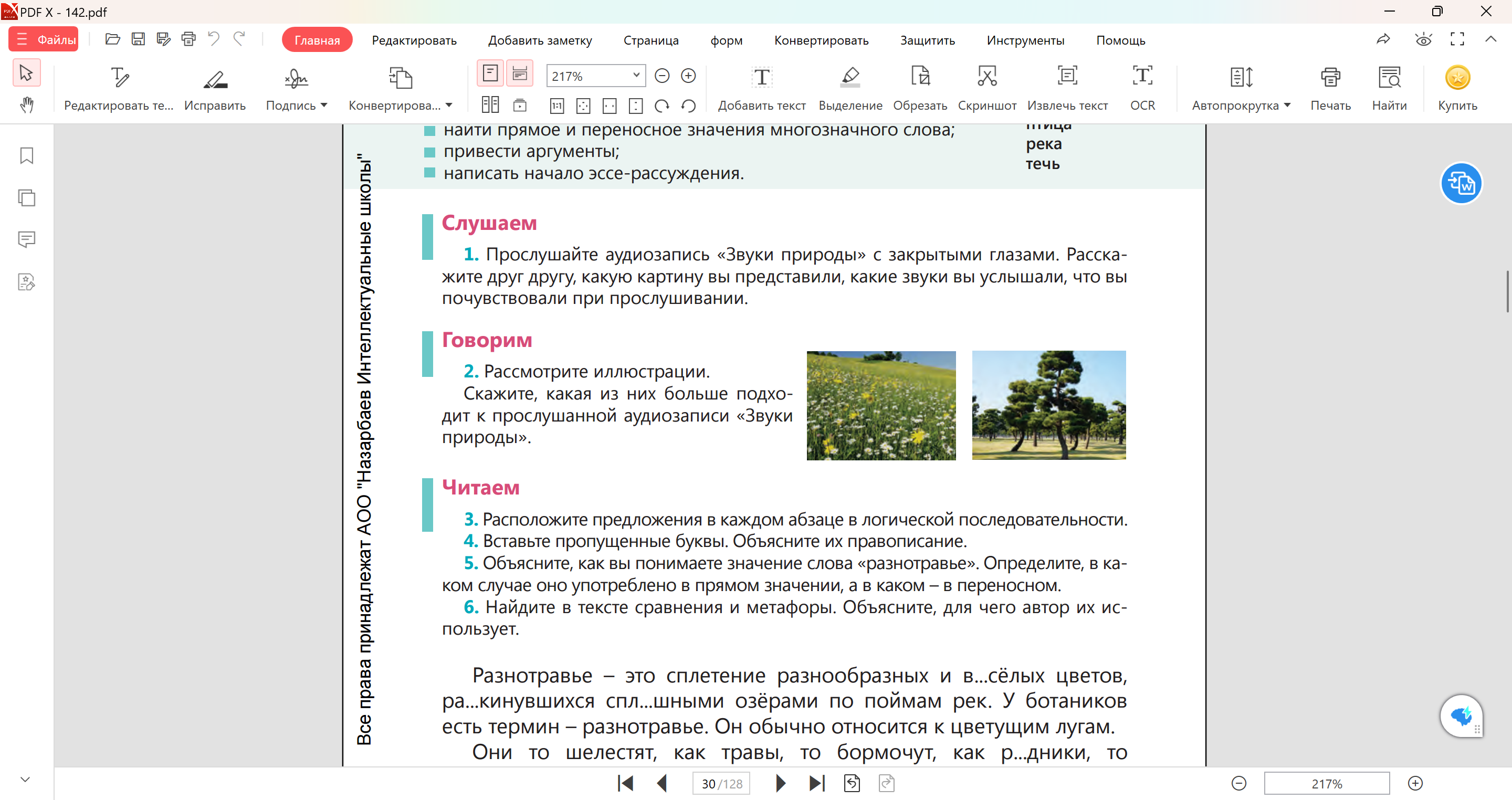 Задание 1. Прочитайте текст. Выполните задания. Разнотравье – это сплетение разнообразных и в...сёлых цветов, ра...кинувшихся спл...шными озёрами по поймам рек. У ботаников есть термин – разнотравье. Он обычно относится к цветущим лугам. Они то шелестят, как травы, то бормочут, как р...дники, то пересвистываются, как птицы, то позванивают, как первый лёд, то, наконец, л...жатся в нашей памяти м...длительным строем, подобно течению звёзд. Слова у Пришвина цв...тут и сверкают. Прозу Пришвина можно с полным правом назвать разнотравьем русского языка. 1. Расположите предложения в каждом абзаце в логической последовательности. 2. Вставьте пропущенные буквы. Объясните их правописание. 3. Объясните, как вы понимаете значение слова «разнотравье». Определите, в каком случае оно употреблено в прямом значении, а в каком – в переносном. 4. Найдите в тексте сравнения и метафоры. Объясните, для чего автор их использует. 5. Введите текст в ИИ и задайте вопрос: «Почему автор сравнивает слова с растениями, а не с камнями или механизмами?»