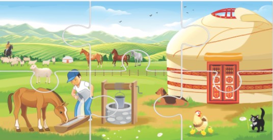 Учащиеся вступают в диалог с учителем, рассказывают, что они знают о юрте. Читают отрывок из стихотворения К. Баянбаева «Юрта». Подбирают к выделенным словам-предметам слова-признаки, слова-действия. |
