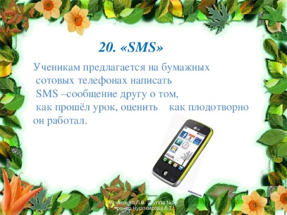 -У вас на партах лежат бумажные телефоны, напишите СМС о том, как прошел урок, оцените себя как вы плодотворно работали на уроке. И положите свои телефоны в тот ящик, который вид деятельности вам понравился больше всего |