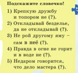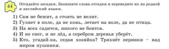 Слушают объяснение учителя. Приводят примеры загадок. Слушают загадку. Повторяют последнюю строчку хором. Отгадывают слово и переводят его. Читают загадки. Сопоставляют загадку с отгадкой. Переписывают пословицы. Придумывают и записывают ситуацию. . Смотрит на картинку. Повторяет движение (прыжок, наклон, взмах руками). Объясняют её смысл. |