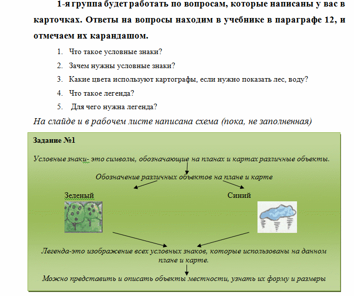 Актуальность изучаемой темы. Создание коллаборативной среды. Физминутка «гимнастика сидя» Слушают Выполняют упражнение Проверка домашнего задания «Парад планет» (названия планет Солнечной системы) Слушают и задают вопросы. Выполняют задания Задание для групп: нарисовать план пути в школу. Формируют группы Рисуют, объясняют. Находят различия в изображении. Ставят для себя цели и задачи что хотят узнать на уроке |