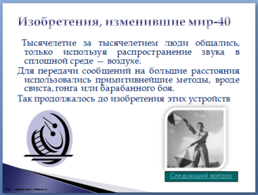 Деятельность учителя: Учитель раздает каждой группе задания, в котором имеются эти рисунки с вопросами. 1.Что объединяет эти рисунки? 2. В чем преимущество и недостатки «электронного носа» Деятельность учащихся Работают в группе и рассуждая делают свои выводы, которые выносят на обсуждение Оценивание: Взаимооценивание групп Дома: Подумайте Цель: Выявление учащихся, имеющих более широкий кругозор, умеющих анализировать информацию, делать выводы Действия учителя: Объясняет учащимся выполнение домашнего эксперимента Описание-инструкция: 1.Возьмите три пластиковых стаканчика. 2.На дне каждого стаканчика с помощью кнопки сделайте отверстие. 3.Отрежьте капроновую нитку длиной 5–6 метров. 4.Проденьте нитку с наружной стороны дна каждого стакана через отверстие и внутри стакана завяжите узелок. 5.Возьмите с другом по стаканчику и разойдитесь на такое расстояние, чтобы нитка была натянута. 6.Попросите твоего друга что-нибудь прошептать в его стаканчик, а сами в это время приложите свой стакан к уху. Слышите ли вы то, что сказал друг? 7. Поменяйтесь ролями. 8.Отрежьте еще один кусок нити длиной 2,5–3 метра, на один его конец «наденьте» третий стаканчик, а другой конец привяжите к нитке, соединяющей два первых стаканчика, примерно посередине. В конце урока учитель подводит итоги урока и проводит рефлексию с учениками: - что знаю, что узнал - что до конца не понял - с чем нужно продолжить работу. |