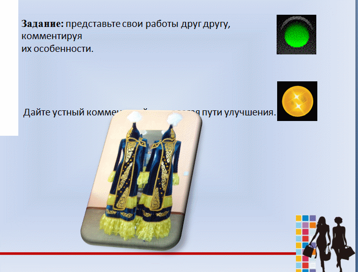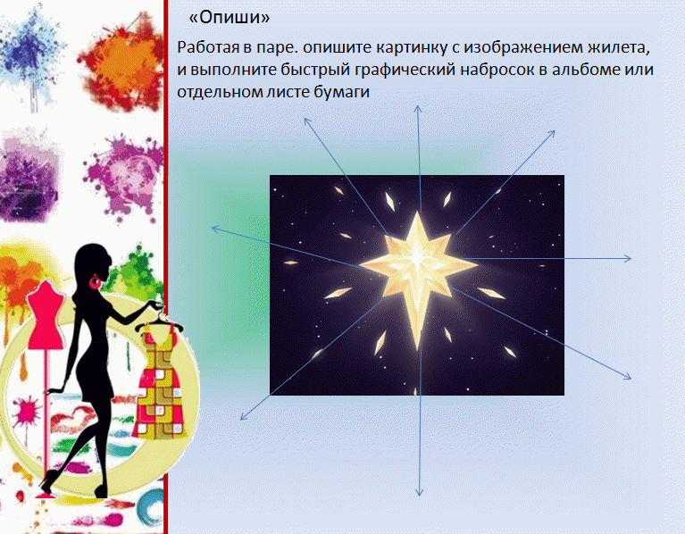 Организационный этап: учитель настраивает учащихся на продуктивную учебную деятельность и на получение новых знаний; создает условия для мотивации в учебном процессе с помощью приема «Опиши»: Учащиеся объединяются в пары путем свободного выбора или случайного выбора, для чего учитель может попросить всех образовать замкнутый круг и во время того, как звучит музыка, учащиеся свободно передвигаются по отношению друг к другу. После того, как музыка остановилась, те учащиеся, которые оказались рядом друг с другом, образовывают пару. Пары учащихся располагаются в кабинете и выполняют задание: один из учащихся словесно описывает картинку с изображением жилета, а другой – выполняет быстрый графический набросок в альбоме или отдельном листе бумаги. По окончании времени учитель просит учащихся в парах сравнить готовые изображения и графические наброски. Учитель обращает внимание учащихся на то, что чем больше оказались похожи эти два изображения, тем лучше была работа в паре среди учащихся, и проводит аналогию с работой, которая может происходить в классе – чем дружней работают учащиеся, тем интересней и качественней получится работа.