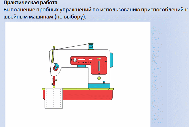 Практическая работа 1 этап. Учащиеся объединяются в группы любым способом для выполнения пробных упражнений по использованию приспособлений к швейным машинам(по выбору). Каждой группе предлагается на выбор вид приспособления к швейной машинке и вид материала. 2 этап. Учащиеся в группах выполняют образец двойного шва или обметочной строчки, в соответствии с информацией в приложении 4