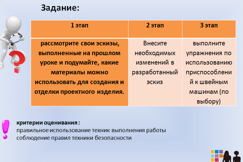 Творческая работа Данный вид деятельности состоит из 2 этапов: 1 этап. Учащимся необходимо рассмотреть свои эскизы, выполненные на прошлом уроке и подумать, какие материалы можно использовать для создания и отделки проектного изделия. Далее –нужно подумать, обсудить и выбрать материалы для создания, отделки и декорирования проектного изделия. 2 этап. Внесение необходимых изменений в разработанный эскиз, подготовленный на предыдущем уроке, с учетом свойств и функциональных особенностей материалов.
