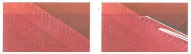 Отстрочить припуски близко к срезу "зигзагом" максимальной ширины, но не выходя за ее пределы. Обрезать ножницами близко к строчке.