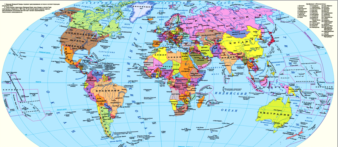 Задание 2. Политическая карта мира — географическая карта, отражающая страны мира, их форму правления и государственного устройства. Политическая карта мира находится в процессе постоянных изменений, происходящих в результате войн, договоров, распада и объединения государств, образования новых независимых государств, изменения форм государственного устройства, утрат государственности /политического суверенитета, изменения площади государств/стран/- территории и акватории, их границ, замену столиц, изменения названий государств /стран/ и их столиц.