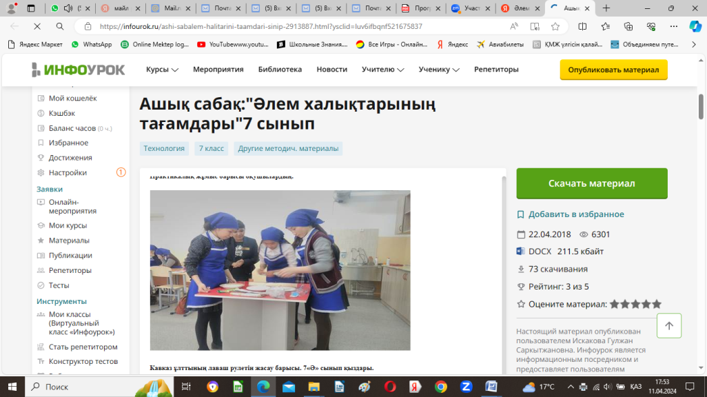 7.2.4.2 Әлем халықтарының және ұлттық тағамдардың жасалу технологияларын зерделеу және қолдану. |