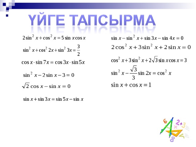 Есептерді шығарыңдар 1) 2sin2 x – 3 sin x +1 = 0 2) 6tg2 x + tg x -1 = 0 3) cos 5x + cos 3x = 0 |