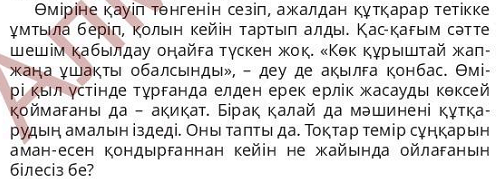 4-тапсырма Саралау тапсырмасы 1 деңгей Соңғы абзацты оқып, Тоқтардың ерен ерлігін сипаттап айт. Қас-қағым сәтте шешім қабылдау оңайға түскен жоқ. Бірақ қалайда мәшинені құтқарудың амалын іздеп тапты. Тоқтар темір сұңқарын аман-есен қондырды.