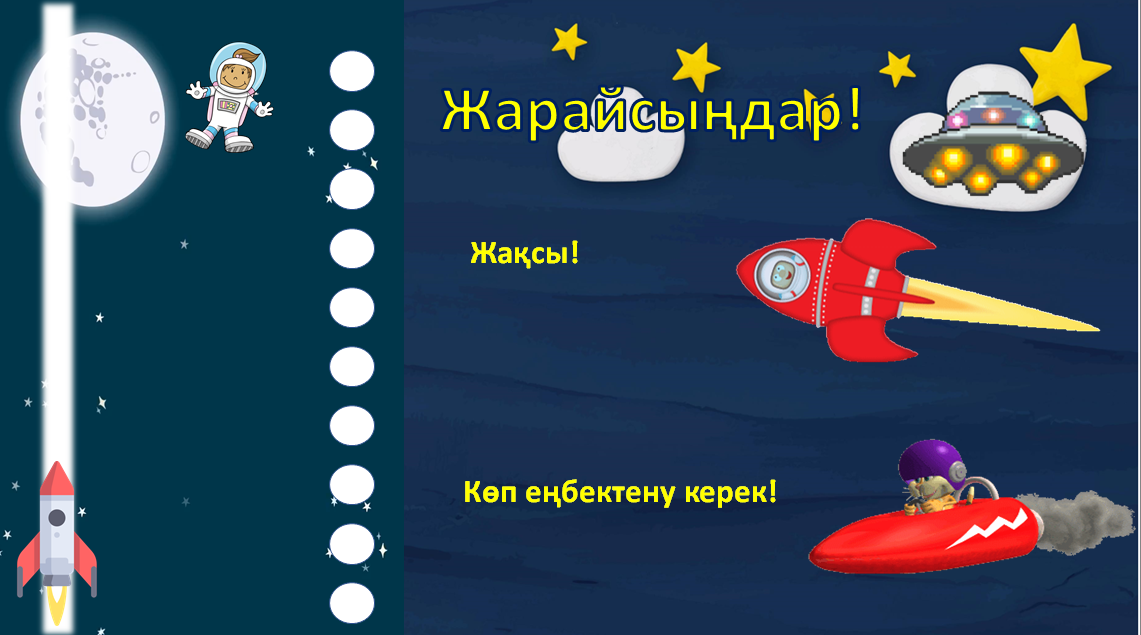 ҚБ 3-тапсырма Топтық жұмыс ОДД:білу,түсіну,қолдану «Ойлан жұптас,талқыла» әдісі 1 топ Кейіпкер "қиындыққа қарсы тұра білу" дегенді қалай түсіндіреді? Кейіпкер "қиындыққа қарсы тұра білу" дегенді қандай қиындық болса да шыдап, сабырлықпен шешімін табу деп түсіндіреді. Сонымен қатар кез келген ғарышкердің міндеті-берілген тапсырманы аяғына дейін орындап, елдің үмітін ақтау деп түсіндіреді.