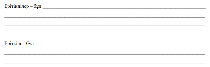 Дескриптор: -Әрбір ұғымды берілген сипаттамалармен сәйкестендіреді Дескриптор: Суреттердің атауын жазады Дескриптор: -Сұрақтарға жауап береді |