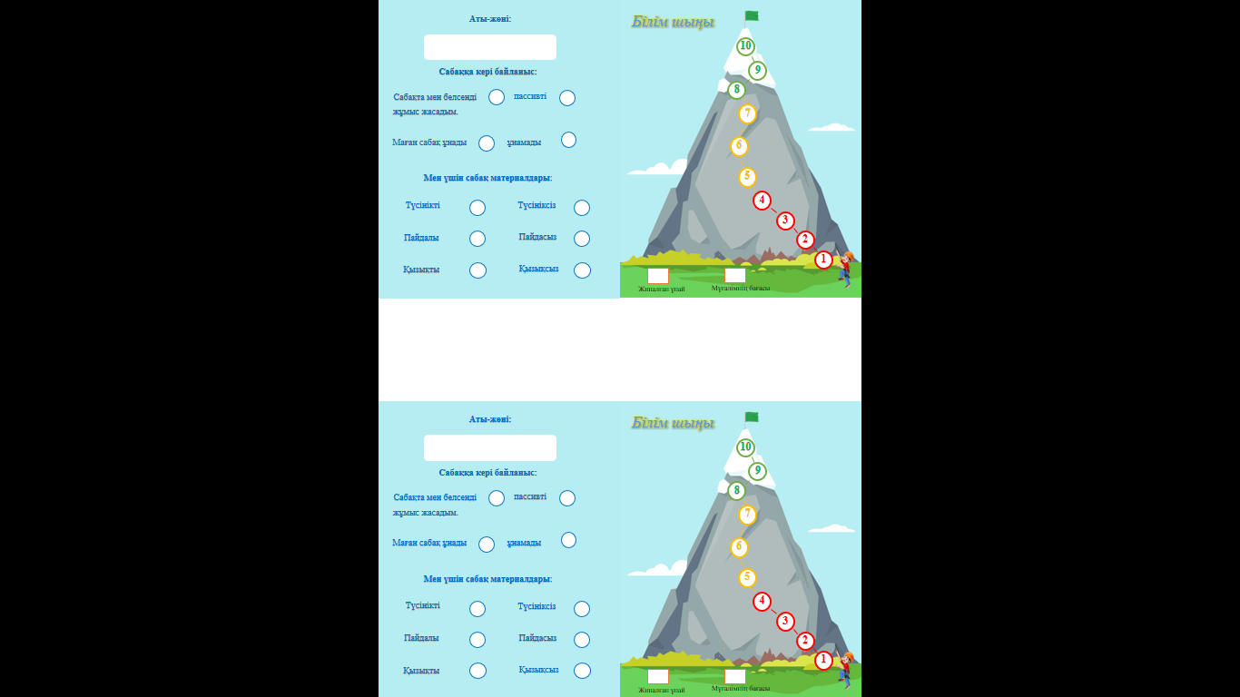 Оқушылар бағалау парағы арқылы өзін-өзі бағалайды. Әр тапсырмаға 1 балл. |