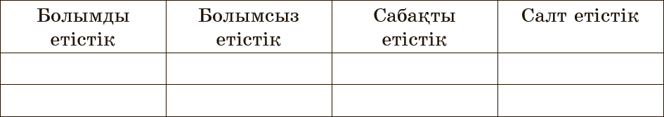 Етістікті түрлеріне қарай ажыратып жазады. Болымды етістік: тоқы, тазала, қайна, сайра, суғар, жарқыра, күркіре, сіркіре, жұмыл, шап, жаз, шеш, ұш. Болымсыз етістік: көрсетпе, көшірме, түңілме, кеспе, қашпа. Сабақты етістік: Тоқы, көрсетпе, тазала, көшірме, суғар, шап, кеспе, жаз, шеш. Салт етістік: қайна, сайра, озба, жарқыра, күркіре, сіркіре, жұмыл, түңілме, қашпа, ұш.