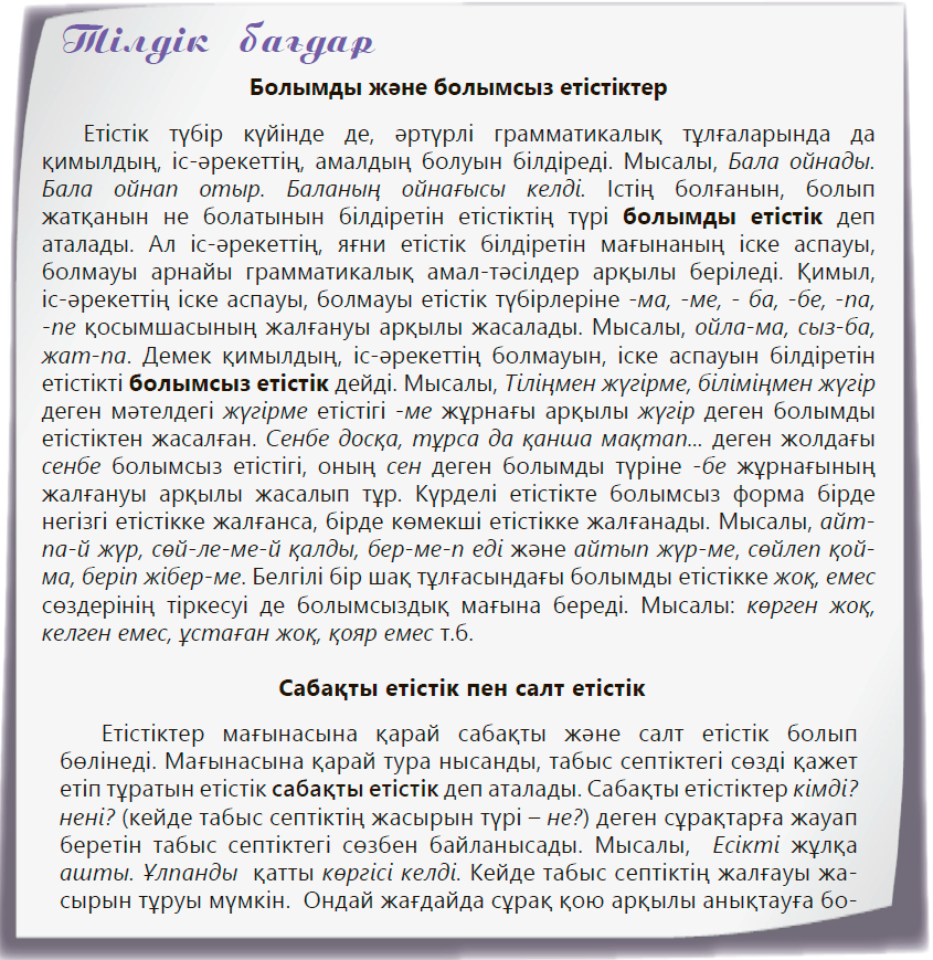 әкесімен сөйлесті, көліктен түсті Қорытындылау Спорт туралы мақалдар тауып, етістік түрлерін анықта. Үлгі: Мықтылық мұратсыз келмейді. (болымсыз етістік) Күш атасын танымас (сабақты етістік) Рефлексия «Шығу парағын» пайдаланып, төмендегі сұрақтарға жауап бер.