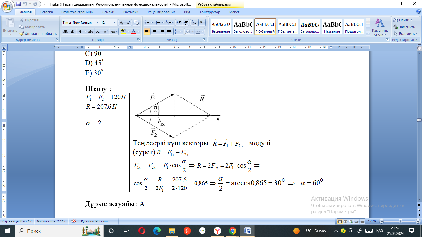 Ұйымдастыру формасы: жеке жұмыс Қолданылған әдіс-тәсіл: толықтыру №1 Серіппелі динамометрге қарама-қарсы бағытта 4 Н және 7 Н күштер әсер етеді. Динамометрдің көрсететін мәні қандай? Егер динамометрге қарама-қарсы бағытта әрқайсысы 5 Н тең күш әсер ететін кезде қалай өзгереді? №2. Серіппе массасы 400 г жүк ілінген бос ұшынан 0,8 м/с2 үдеумен вертикаль жоғары көтерілді. Серіппенің қатаңдығы 250 Н/м. Серіппенің массасын ескермей, оның ұзаруын анықтаңдар. Қозғалыс басталғаннан 5 с өткеннен кейінгі жүктің жылдамдығын табыңдар. Бір нүктеге түсірілген әрқайсысы 120 Н-ға тең екі күштің тең әсерлі күшінің модулі 207,6 Н болса, күштердің арасындағы бұрыш Шешуі: