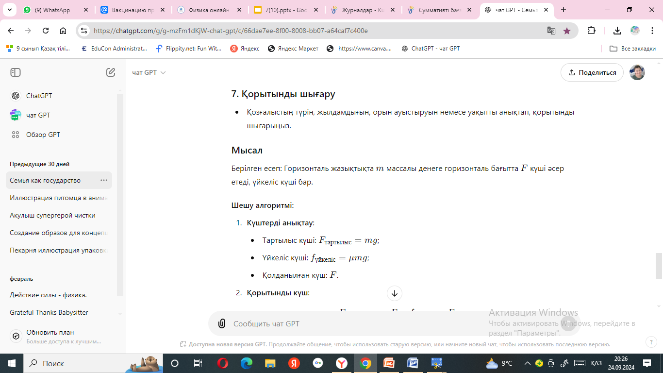 Оқушылар күштердің түрлері, инерциялық санақ жүйесі, Ньютон заңдары туралы ақпаратты толықтыра отырып топ ішінде талқылау жасайды. топ оқушылары бірнеше күштің әрекетінен болатын дененің қозғалысына есеп шығарудың алгоритмін құрады.Топ спикерлері топтық жұмысты қорғайды. |