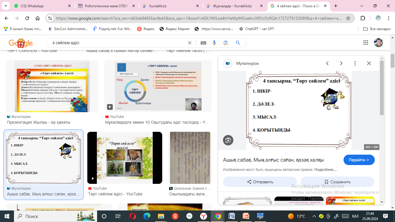 Рефлексия. « Төрт сөйлем». Пікір : сабақ бойынша туындаған өзіндік пікіріңізді 1 сөйлеммен келтіріңіз. Дәлел: Келтірілген пікірді 1 сөйлеммен дәлеледеңіз. Мысал: өзіндік пікірді тағы да 1 негіздеп кету үшін 1 сөйлеммен мысал келтіріңіз. Мысал өмірден алыну керек. Қорытынды: өзіндік пікірді тағы да бір рет пысықтап қорытынды шешіміді 1 сөйлеммен келтіріңіз.