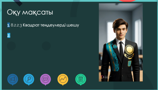 2. Квадрат теңдеу деп қандай теңдеуді айтамыз? Оның жалпы түрі қандай? 3. Квадрат теңдеудің түбірлерін табу үшін қолданылатын формулалар қандай?