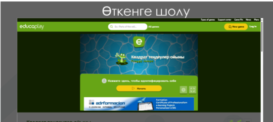 Сыныптағы оқушылардың көңіл күйлерін сұрап, жағымды ахуал туындату; Үй тапсырмасын тексеру Оқушыларды түгелдеу; Сабақтың мақсатымен таныстыру Өткенге шолу «Едука плэй» платформасында интерактивті тапсырмаларды орындай