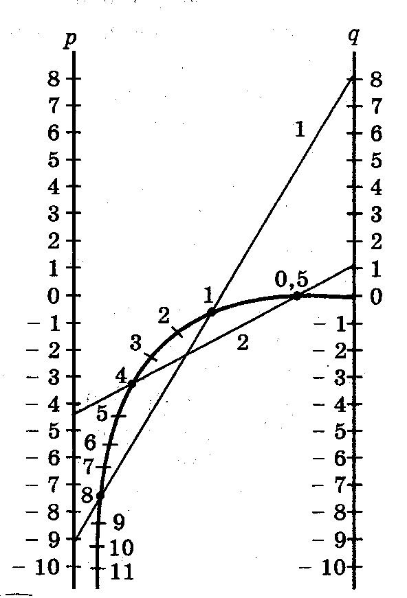 Бұл квадрат теңдеуді шешудің бұрынғы және көне ұмыт болған әдісі.83 (см. Брадис В.М. Четырехзначные математические таблицы. - М., Просвещение, 1990).Брадис таблицасында z2+pz+q=0 теңдеуін шешуге арналған номограмманы қарастырайық. Бұл номограмма квадрат теңдеудідің түбірлерін анықтауға мүмкіндік береді. Номограмманың қисық сызықты шкаласы төменгі формулалар бойынша тұрғызылған (11 сурет):