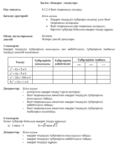 Дескриптор: - квадрат теңдеу түбірлерінің қосындысын табады. -квадрат теңдеу түбірлерінің көбейтіндісін табады. -квадрат теңдеудің жалпы түрін құрады. С деңгейі
