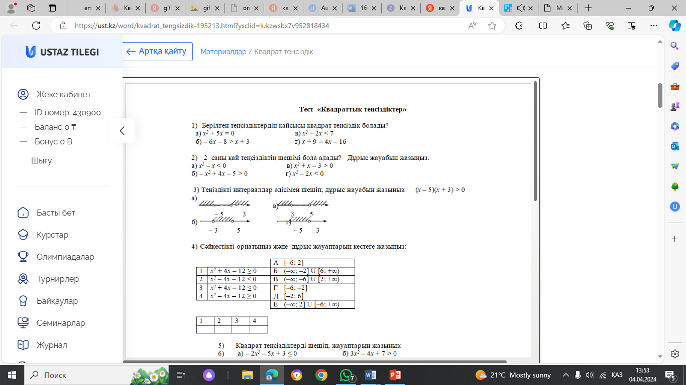 -Квадрат теңсіздіктің D>0, D=0, D<0 болғандағы графиктердің орналасуын, график бойынша теңсіздіктің жауабын жазу; - Квадрат теңсіздіктерді шешу; |