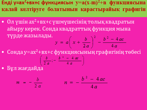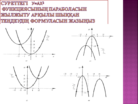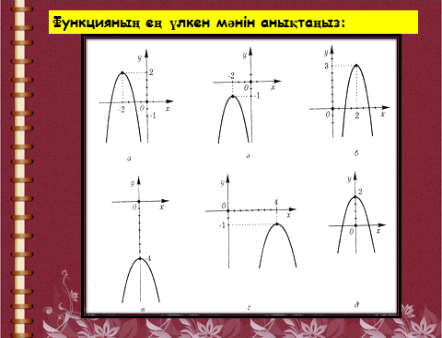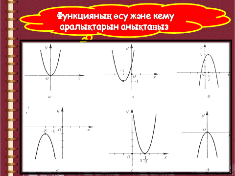 Функция графигінің қалай аталатынын білу, төбесінің координаталарын анықтай алу, функция графигінің координата осьтерімен қиылысу нүктелерінің координаталарын анықтай білу, графигін салып білу, графикті пайдаланып, өсу-кему аралықтарын табу, ең үлкен және ең кіші мәндерін табу |