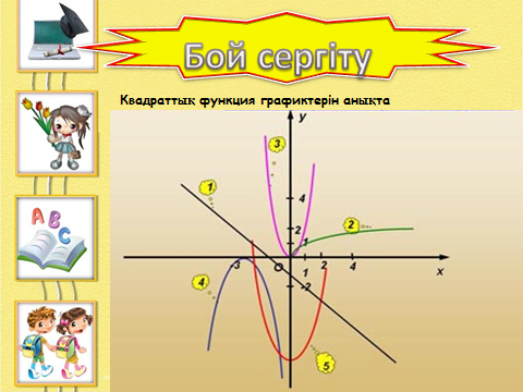 Функция графигінің қалай аталатынын білу, төбесінің координаталарын анықтай алу, функция графигінің координата осьтерімен қиылысу нүктелерінің координаталарын анықтай білу, графигін салып білу, графикті пайдаланып, өсу-кему аралықтарын табу, ең үлкен және ең кіші мәндерін табу |