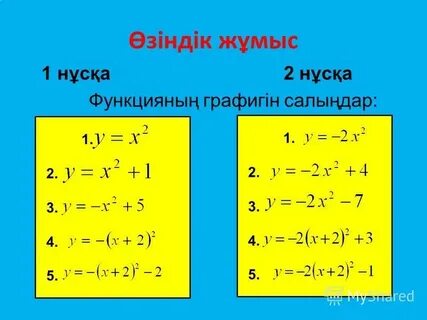 а функциясының графигін m оң сан болғанда Ох осі бойымен m бірлікке солға, m теріс сан болғанда оңға және n оң сан болғанда Оу осі бойымен n бірлікке жоғары, n теріс сан болғанда тӛмен жылжыту арқылы алынады.) Жұптық жұмыс: «Жұбын тап» әдісі арқылы сәйкес функцияның теңдеуін табыңдар: 1 - жұп: у=- 2х2 функциясы: а) Ох осінің бойымен 2 бірлікке оңға; ә) Оу осінің бойымен 5 бірлікке тӛмен; б) Ох осінің бойымен 1 бірлікке солға және 3 бірлікке жоғары ; в) Оу осінің бойымен 5 бірлікке жоғары; г) Ох осінің бойымен 1 бірлікке оңға және 4 бірлікке тӛмен жылжыту арқылы алынған.