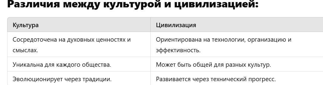 Культура есть совокупность духовных ценностей, а цивилизация — совокупность ценностей материальных.