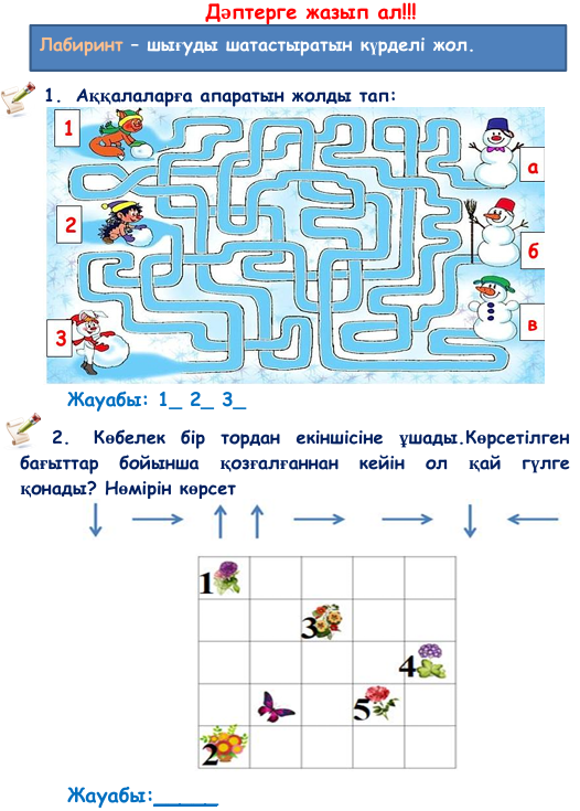 Топтарға бөлінеді, "ДЖИГСО" әдісі бойынша жаңа ақпаратты топтрада талқылайды Дескриптор: - анықтаманы дәптерге жазады - лабиринтте жолдарды табады - гул нөмірін жазады - сергіту жаттығуларын жасайды - сәйкестікті белгілейді - сәйкестікті белгілейді - интерактивті тапсырманы орындайды - роботқа арналған бағдарламаны құрады