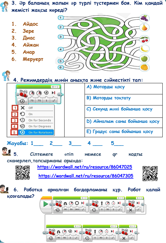 Топтарға бөлінеді, "ДЖИГСО" әдісі бойынша жаңа ақпаратты топтрада талқылайды Дескриптор: - анықтаманы дәптерге жазады - лабиринтте жолдарды табады - гул нөмірін жазады - сергіту жаттығуларын жасайды - сәйкестікті белгілейді - сәйкестікті белгілейді - интерактивті тапсырманы орындайды - роботқа арналған бағдарламаны құрады |