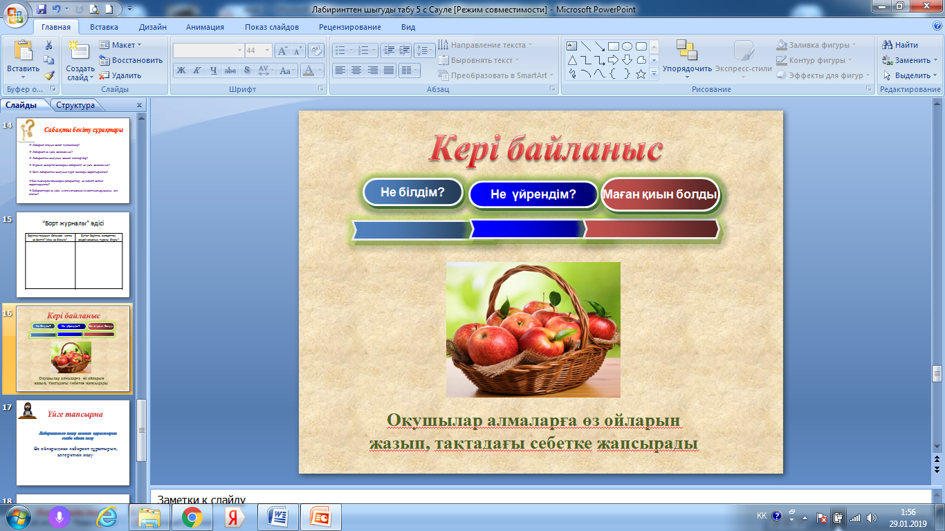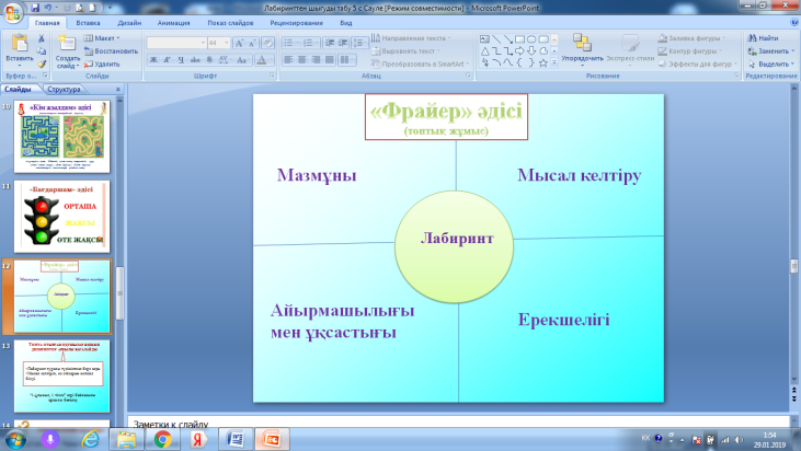 Жаңа сабақ слайд арқылы түсіндіріледі. 3-тапсырма. Топтық жұмыс. Лабиринттен шығу жолды тап ойыны ойнатылады. Оқушылар топппен бірлесе отырып, тапсырманы орындайды. Топтар бірін-бірі «Бағдаршам» әдісі бойынша бағалап шығады. 4-тапсырма. Топтық жұмыс. «Фрайер» әдісі бойынша оқушылар тапсырманы орындайды.