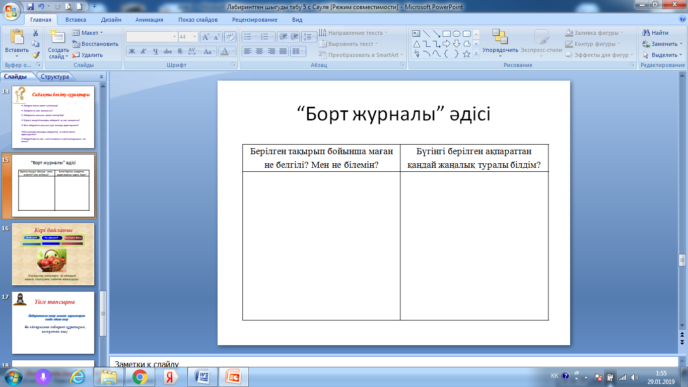 Деп бүгінгі сабақтың тақырыбы мен мақсатын айқындап алу. 2-тапсырма. Жеке жұмыс. «Борт журналы» әдісі бойынша бүгінгі тақырып бойынша нені білетіндерін сұрап, дәптерлеріне жаздыртып алу. Ауызша мадақтау Жарайсың Сенің қолыңнан келеді. Тағы да қайталау керек. |