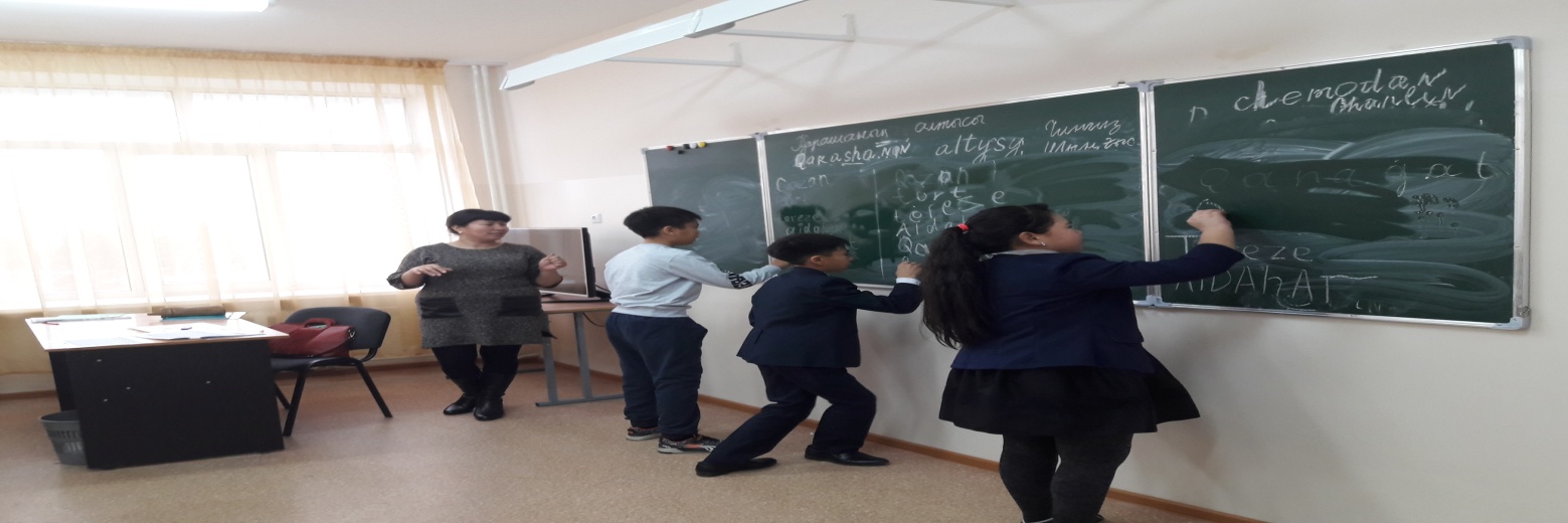 Сынып оқушылары үш топқа бөлініп тақтаға берілген сөздерді жылдам және қатесіз жазу сайысына кірісті. Қателер болса талдап, ұсыныстар айтылып отырылды.